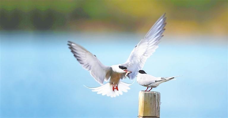 敏捷的普通燕鷗在洲灘養(yǎng)足了精神,當(dāng)它的雪白翼尖剪開霧幕時(shí),巢卵正藏在浮筏水草的根部。雛鳥破殼時(shí)頭頂戴著略染橘紅的胎帽,像是自然為新生者加冕。不論是饑腸轆轆還是飽食小魚,它的叫聲總是尖銳清脆,猶如冰裂,與尕海湖的水聲交織成夏日搖籃曲。
