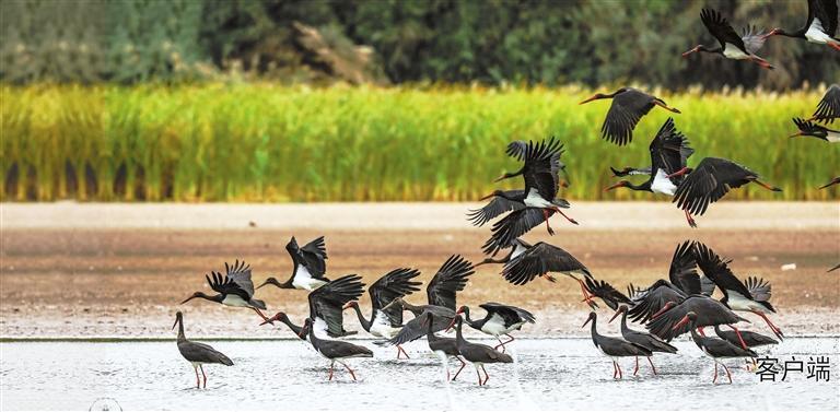 九月的黑河濕地,蘆葦蕩在秋陽下鍍成金箔,黑鸛群如流動(dòng)的墨玉鑲嵌其中。這種因其配色和珍稀程度被稱為“鳥中熊貓”的珍禽,是出色的捕魚能手。隨著它精準(zhǔn)鎖定水下獵物,赤紅色長喙掠過水面,黑、白、紅的絕色搭配如同流動(dòng)的墨畫。中國最大的黑鸛種群——600余只在此集結(jié),夜棲時(shí)其倒影連成一線,讓觀鳥者想起傳世的水墨長卷。