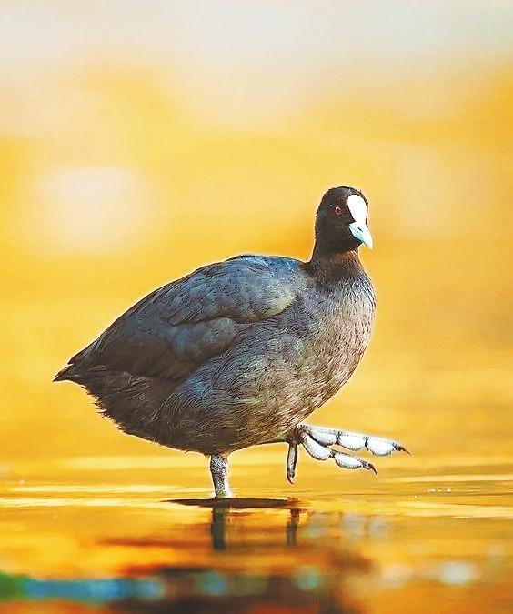 白骨頂又被喚作骨頂雞,卻是鶴類的遠(yuǎn)親。它靜浮水面時(shí),額前一抹象牙白,宛若遺落人間的墨玉鎮(zhèn)紙。這枚額甲實(shí)為特化的角質(zhì)層,是為了保護(hù)頭部的盔胄?;野咨陌牾肴缪┑匮グ惆洪g,劃開水藻時(shí)泛起粼粼波光——這身黑羽配雪蹼的穿搭,竟比時(shí)裝周的極簡主義更先鋒。當(dāng)它們列隊(duì)掠過蘆葦蕩,水淼勾勒的剪影里,仿佛在繪制著秋天的信箋。