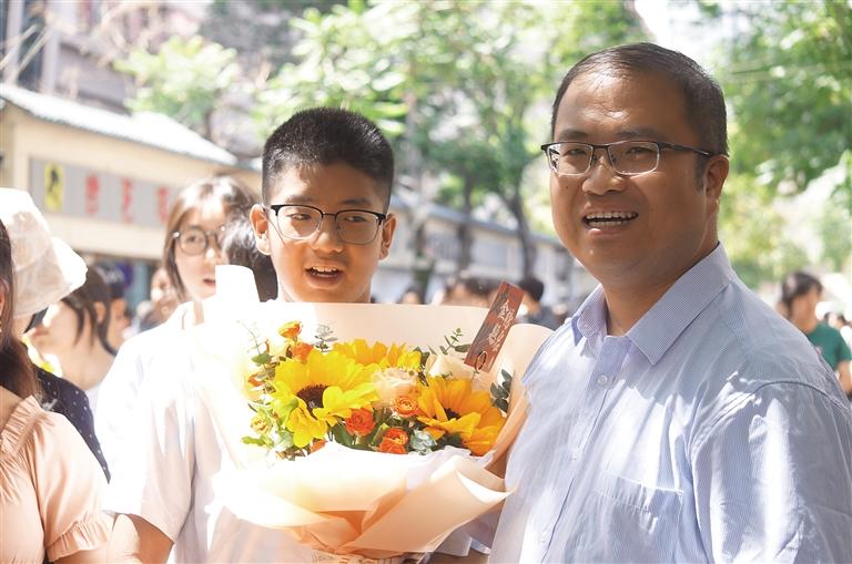 花束也是祝福的首選,“一舉奪魁”的向日葵更是家長(zhǎng)們的最愛。在各考點(diǎn)附近的鮮花店里,以向日葵為核心的花束賣得格外好。首科的語文考試結(jié)束后,考生們最先收到的就是鮮花,還有媽媽的擁抱。