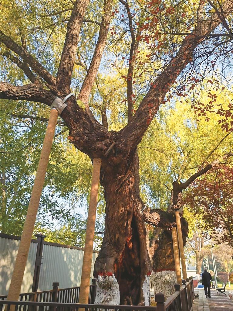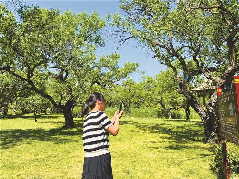 行至平沙落雁,路旁綠草之上,一株百年文冠果樹上果實累累,宛如哨兵般靜靜守候,為熱鬧的街市增添了幾分寧靜。在綠色公園內(nèi),一株700年樹齡的古國槐枝繁葉茂。復(fù)古的支架穩(wěn)穩(wěn)支撐著枝干,既確保它在歲月中安然生長,又透出滄桑之感?;◢弾r圍欄環(huán)繞四周,其上雕刻的荷葉荷花圖案栩栩如生,“愛護(hù)樹木”“保護(hù)生態(tài)”等文字清晰可見,無聲地倡導(dǎo)著人們保護(hù)環(huán)境、愛護(hù)植物。退休教師王淑芬正帶著小孫女玩耍,她笑著說:“這兒空氣好,景色美,每天帶孩子來親近古樹,也是在給她種下愛護(hù)自然的種子。”游客的歡笑聲、孩童的嬉戲聲與清脆的鳥鳴聲交織在一起,為古樹增添了別樣的活力。