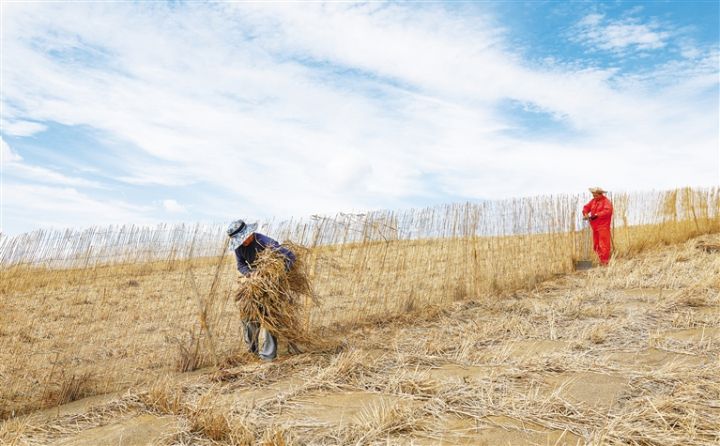 近日,在金塔縣黑河中游防沙治沙林草綜合治理項(xiàng)目固沙現(xiàn)場(chǎng),工人在起伏的沙丘上或鋪設(shè)草方格沙障,或搭建高立式沙障,努力為沙漠邊緣的綠洲、城市筑起屏障。