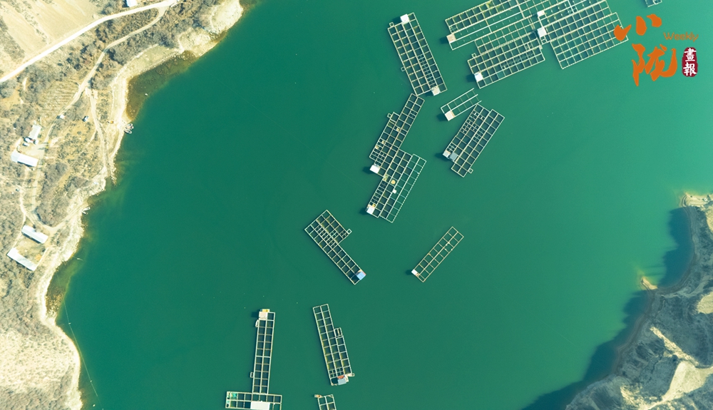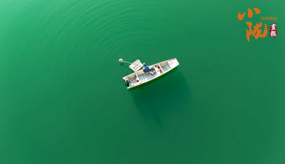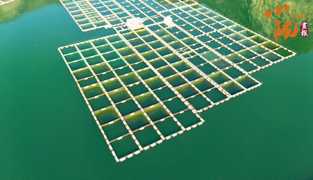 在這片湛藍的湖水中,一方方網(wǎng)箱靜靜地泊著,如同水上阡陌,將廣闊的湖面勾勒成豐饒的田園。