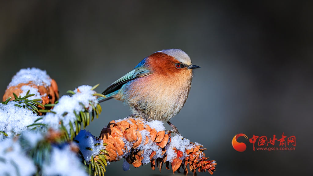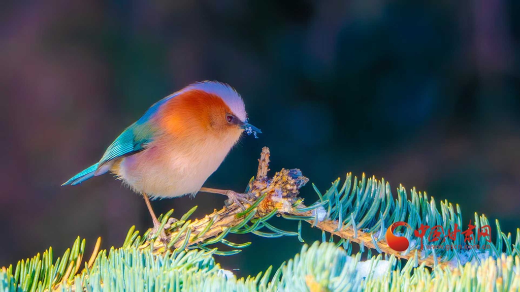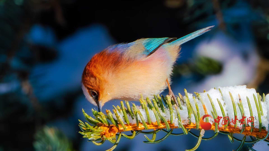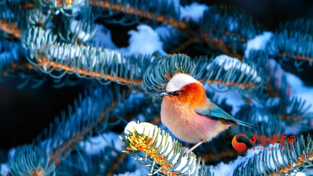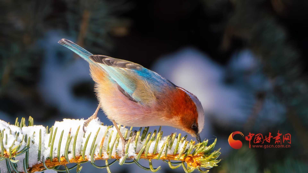 這群被譽(yù)為“祁連山精靈”的小鳥,頭頂雪白羽冠蓬松如絨,仿佛戴上了一頂天然的小絨帽,棕紅面頰溫潤似玉,在陽光下泛著柔和的光澤,藍(lán)綠背羽如同上好的寶石,在雪色映襯下泛著金屬般的質(zhì)感。淡粉與橙白相間的腹羽柔和雅致,層次分明,在純白背景的映襯下,形成強(qiáng)烈而和諧的視覺碰撞,它們或亭亭立于覆雪松枝,或靈巧穿梭于松針間隙,更有靈動(dòng)的個(gè)體俯身探喙,啄取松針縫隙里的昆蟲,一聲輕脆的啄擊,劃破林間的清寂,卻更顯山野幽靜,羽翼輕振間,將“雪中覓食”的鮮活圖景永久定格。