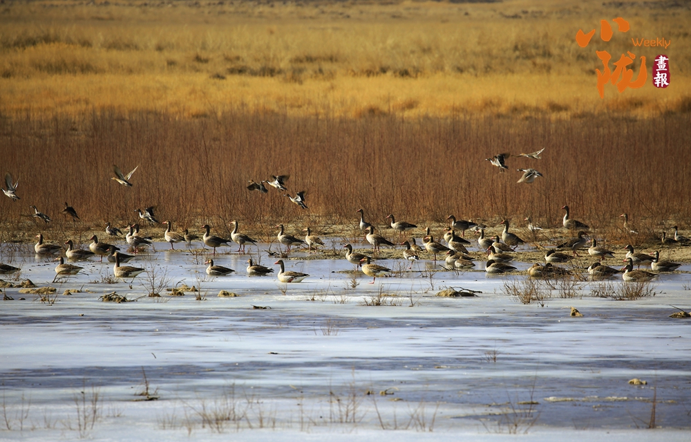 冬日濕地,鳥類或靜立冰面,或翩然飛越金黃蘆葦。每年候鳥遷飛之季,赤麻鴨等國(guó)家重點(diǎn)保護(hù)鳥類在此棲身,鳥鳴與葦浪聲交織回蕩,宛如自然寫就的生態(tài)詩(shī)篇。