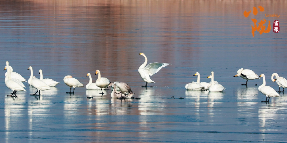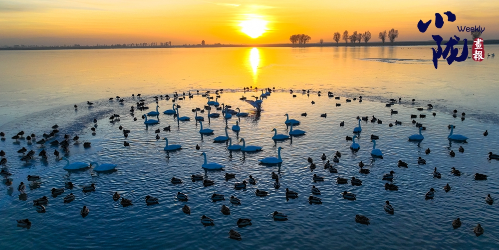 陽(yáng)光斜照,萬(wàn)物生暖。水面上,成群的白天鵝不緊不慢地游著,雪白的身影倒映水中,隨著微波輕輕蕩漾,像是一幅流動(dòng)的水墨畫,素雅而安寧。