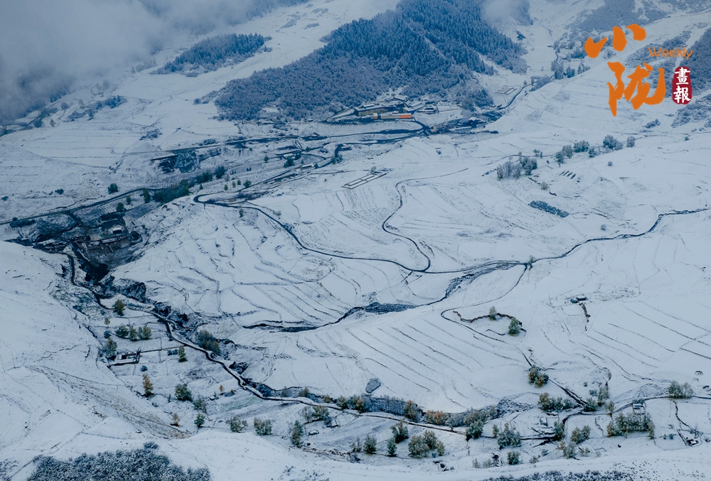 阡陌縱橫的農田披上了素白的紗衣,天地之間,仿佛只剩下黑白兩種顏色,那遠山的輪廓,那梯田的線條,那河床的蜿蜒,構成了最純正的中國水墨畫。