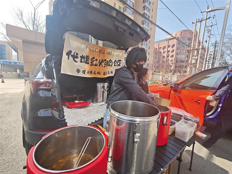 上午11時(shí)20分,甘南路民族飯店門口的人行道上,一輛簡易流動(dòng)餐車準(zhǔn)時(shí)支起攤位。不銹鋼餐盆里,色澤鮮亮的炒肉片蓋飯熱氣升騰,濃郁香氣順著風(fēng)飄向周邊寫字樓,短短幾分鐘,攤位前就排起了七八人的小長隊(duì)。“老板,一份炒肉片蓋飯,多放青椒和咸菜!”“我要兩份,打包帶走!”熟練打飯、快速裝盒、掃碼收款,一氣呵成,不到20分鐘,桶里的米飯就下去了小半桶。