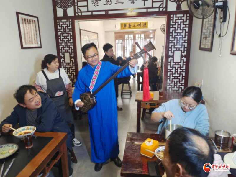 當(dāng)日,北關(guān)市場內(nèi)人流如注、熙熙攘攘,眾多游客與市民齊聚于此,享受美味的同時(shí)觀看涼州賢孝和永昌滾燈,涼州賢孝傳承人賈旭峰與用餐的游客進(jìn)行了互動,人們安逸地享受著這份獨(dú)具涼州特色的煙火美味。