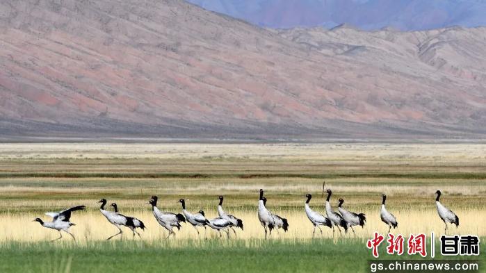 近五年來,保護(hù)區(qū)記錄的野生動物越來越多,生物多樣性也越來越豐富。圖為肅北縣記錄到的黑頸鶴。(資料圖)酒泉市融媒體中心供圖