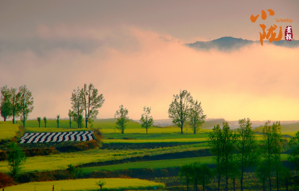 晨霧為華亭的春景蒙上柔紗,遠(yuǎn)山在霞光里若隱若現(xiàn)。層層梯田鋪展著嫩綠與明黃,田壟間覆著的條紋地膜泛著細(xì)光,疏朗的樹木錯(cuò)落點(diǎn)綴,一派朦朧又鮮活的春野意趣。