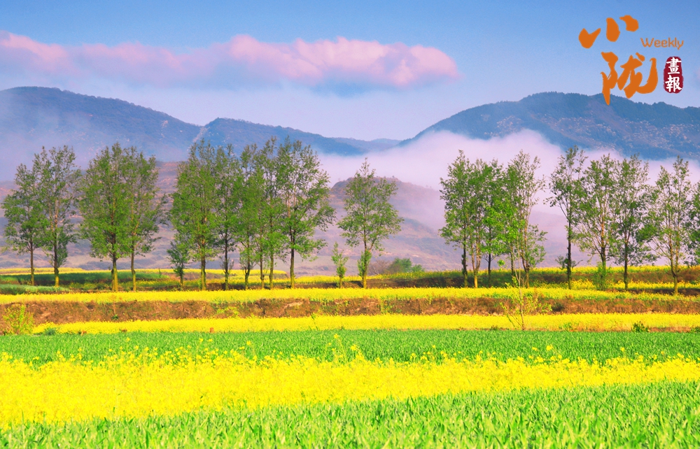 澄澈的藍(lán)天銜著粉紫流云,眼前是望不到頭的油菜花田,明黃的花浪在風(fēng)里翻涌,田埂邊的樹木抽出嫩綠新芽,春日的鮮活與靈動(dòng),全在這山野間漾開。