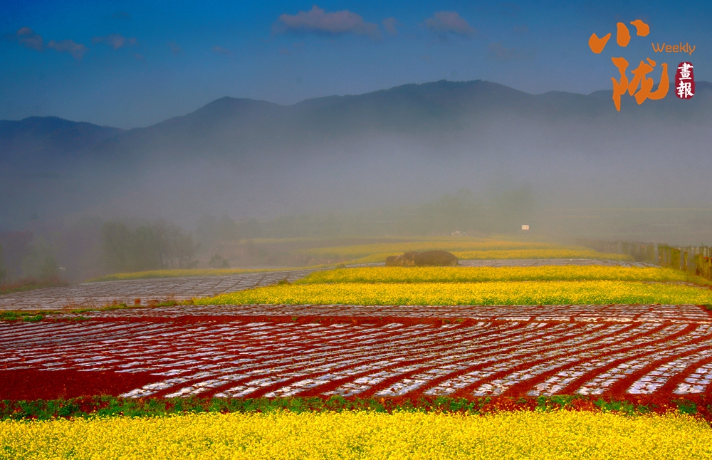 晨霧漫過山巒,梯田鋪展成彩色織錦,黃花似金浪翻涌,紅花如霞錦鋪陳,遠(yuǎn)山含黛,天地間滿是春日的鮮活與詩(shī)意。